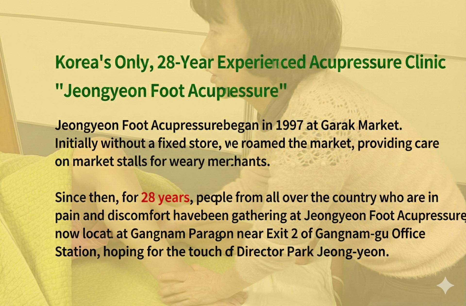 Hello, I am Park Jeong-yeon, the director and master therapist at Jeongyeon Foot Massage in Gangnam, Seoul.