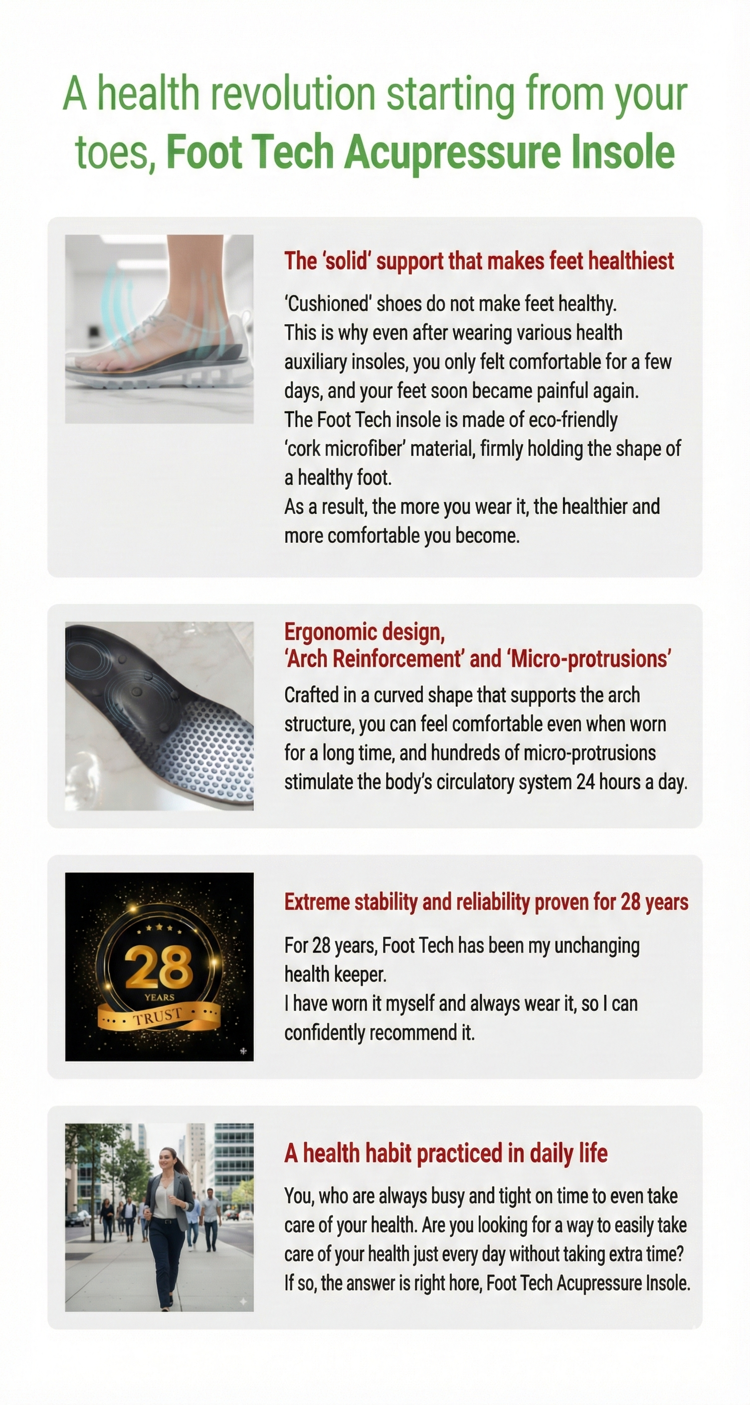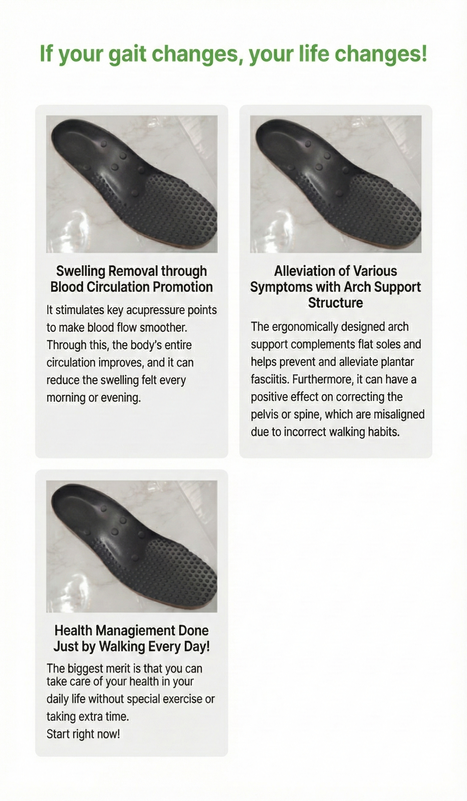 | Consistency | [Hard to Maintain]Often abandoned due to pain. | [Daily Habit]Effortless care just by walking.Protect your feet 24/7. |